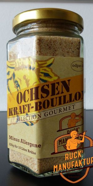 1 Liter Brühe ( Ruck-Ochsenkraft-Boulilon-SELEKTION GOURMET) oder eine selbst gefertigte Fleisch-Hühner oder Gemüsebrühe.