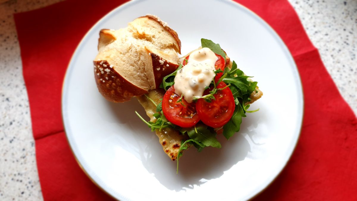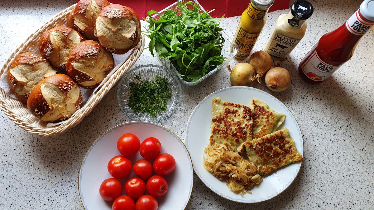 Die schwäbische Spezialität schmeckt auch im Burger. Dazu Maultaschen goldbraun anbraten und mit geschmorten Zwiebeln, Cherrytomaten, Rucola, Kresse und Burgersoße nach Geschmack auf einem Laugenbrötchen servieren. So machen Burger Spaß!