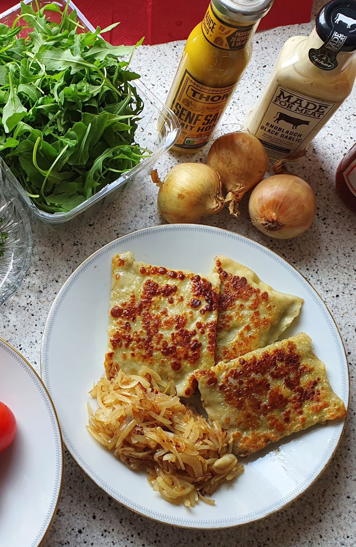 Maultaschen in etwas Öl knusprig von beiden Seiten anbraten.