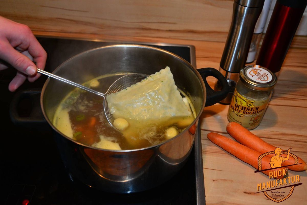 Die Ruck Maultaschen in die kochende Brühe einlegen und darin nur ca. 10min ziehen lassen.